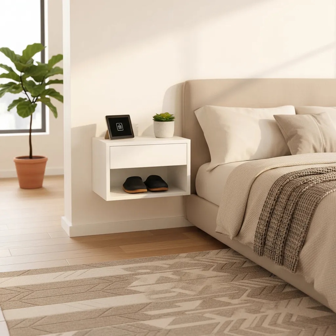 Transforme seu quarto com esta mesinha de cabeceira moderna e funcional, perfeita para quem busca design limpo, praticidade e aproveitamento de espaço.