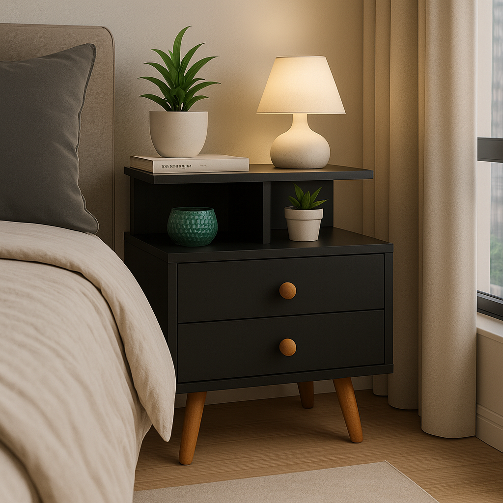 Transforme seu quarto com esta mesa de cabeceira suspensa em MDF preto, de estilo moderno e retrô ao mesmo tempo. Produzida com acabamento fosco, puxadores redondos em madeira natural e design elegante, essa peça une estética, funcionalidade e qualidade superior. O formato suspenso deixa o ambiente mais leve, facilita a limpeza e otimiza o espaço — enquanto o fundo reforçado confere maior estabilidade e acabamento impecável.
